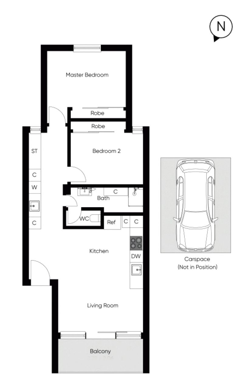 - Living room flows through to balcony via large sliding doors